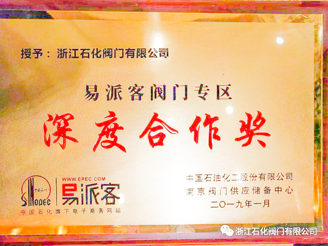 2019年1月11日,中國石油化工股份有限公司南京儲備中心、中國石化國際事業有限公司南京招標中心、中石化國際事業南京有限公司在南京組織召開易派客閥門專區推進會暨閥門供應商年度總結會。浙江石化閥門有限公司憑借過硬的產品質量、完善的服務體系榮獲了“2018年度中國石化優秀閥門供應商”、“易派客閥門專區深度合作獎”的兩項榮譽。該榮譽的取得,是中國石化對浙江石化閥門的充分認可。