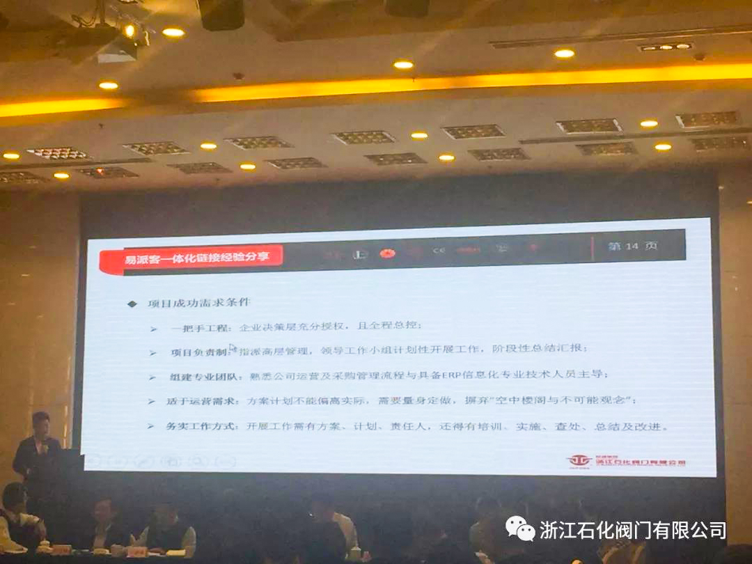 作為最早進入易派客平臺的閥門企業,浙江石化閥門積極響應中石化推進基于互聯網+的供應鏈管理創新要求,從采購、銷售等環節和中石化易派客進行了深度的合作,從而使公司的ERP和易派客能夠互聯互通。會上公司被邀請分享了易派客一體化連接經驗。